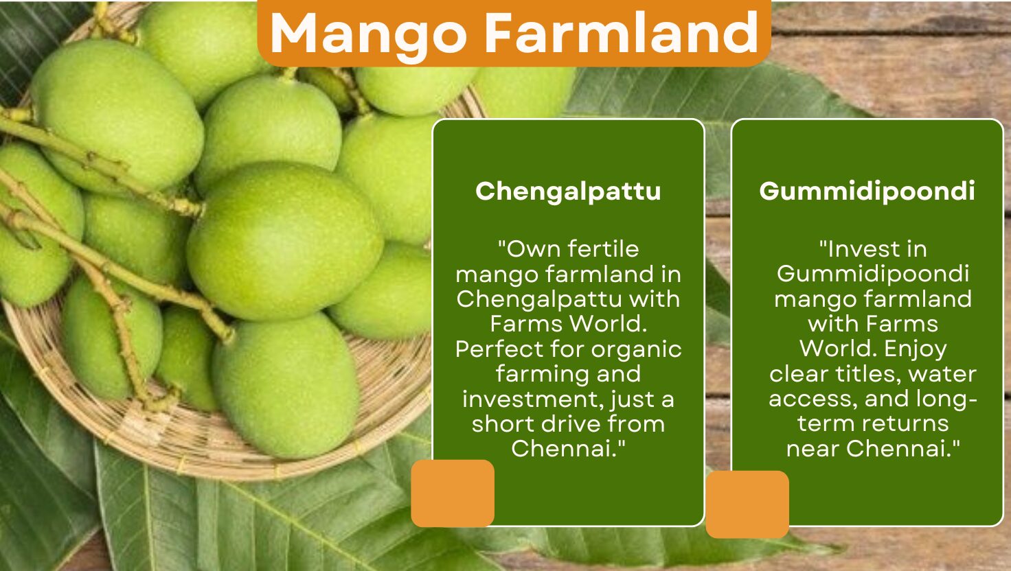 If you’ve been searching for farmland near me, your answer is here. Whether it’s Chengalpattu for convenience, Gummidipoondi for affordability, or Melmaruvathur for tranquility, Farms World offers premium mango farmland in all these locations. Invest today to enjoy long-term returns and a lifestyle close to nature.